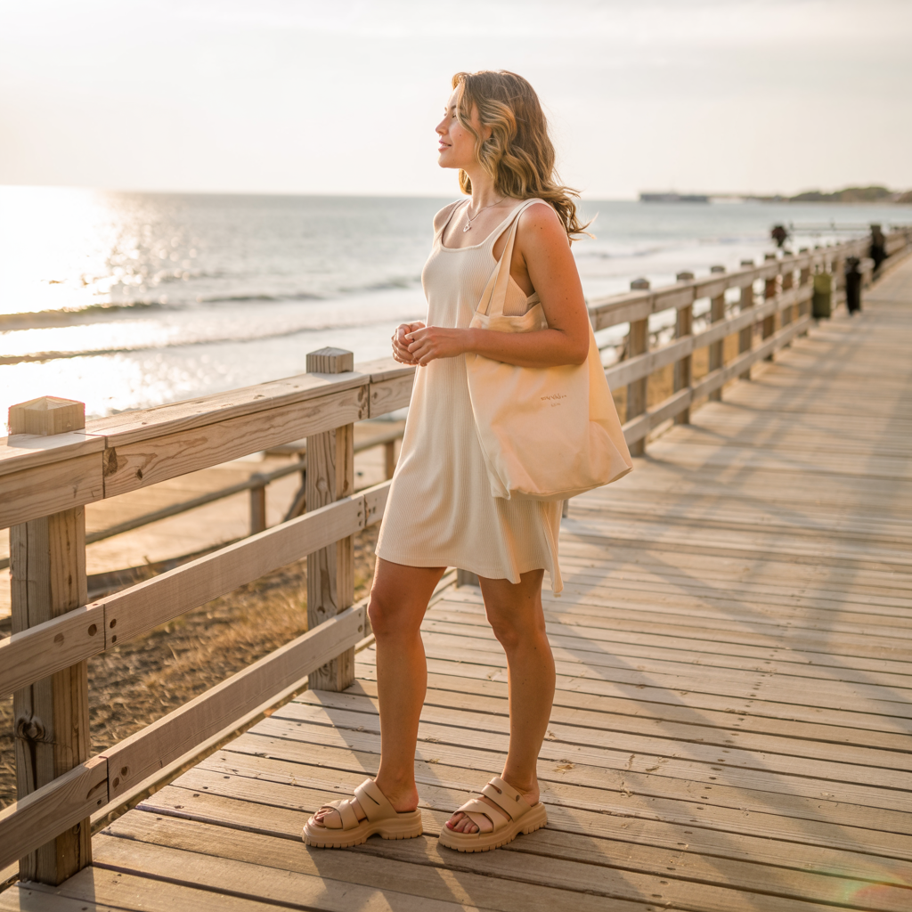 Beige dad sandals + ribbed tank dress + canvas tote.