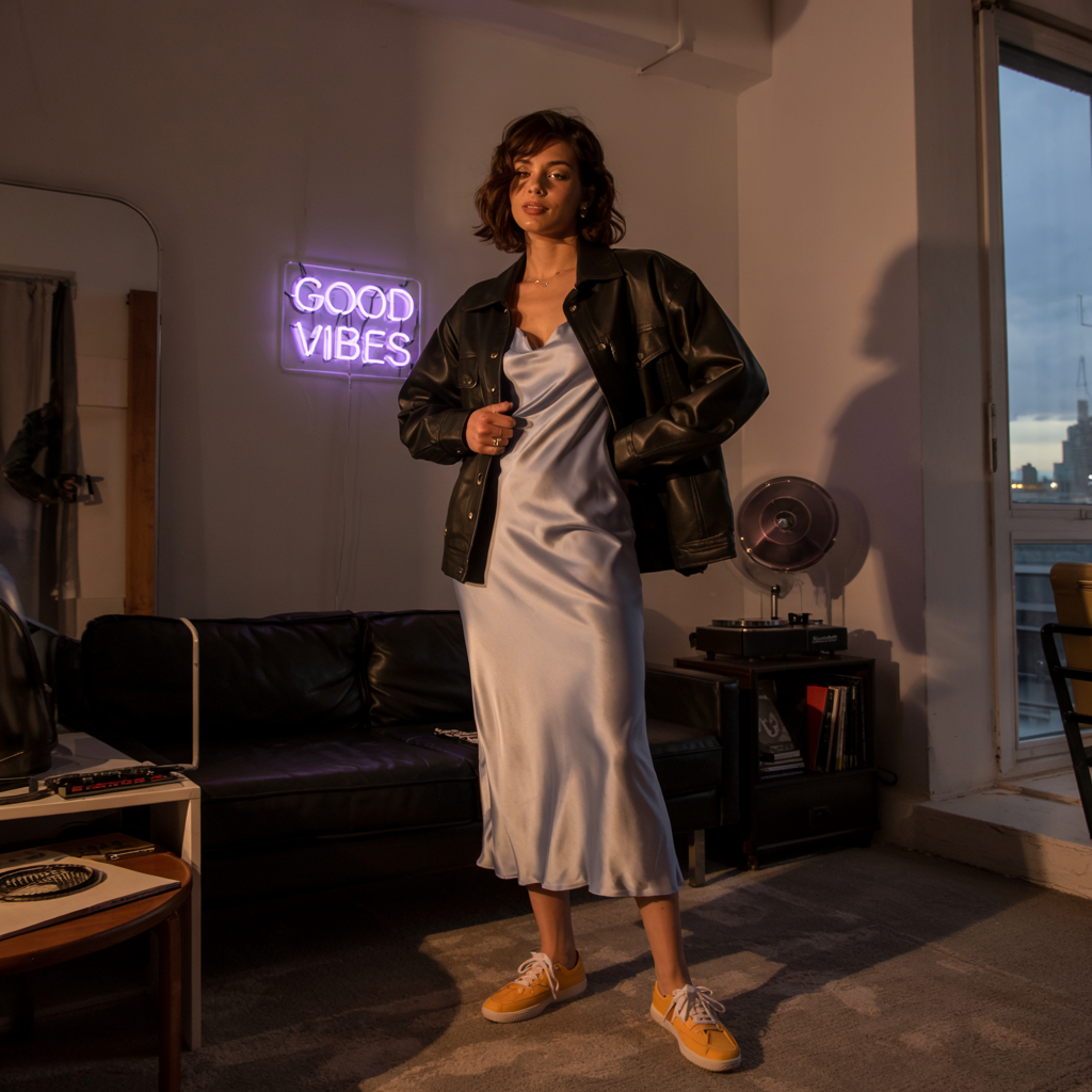 Sambas + midi slip dress + leather jacket + rectangle sunnies.