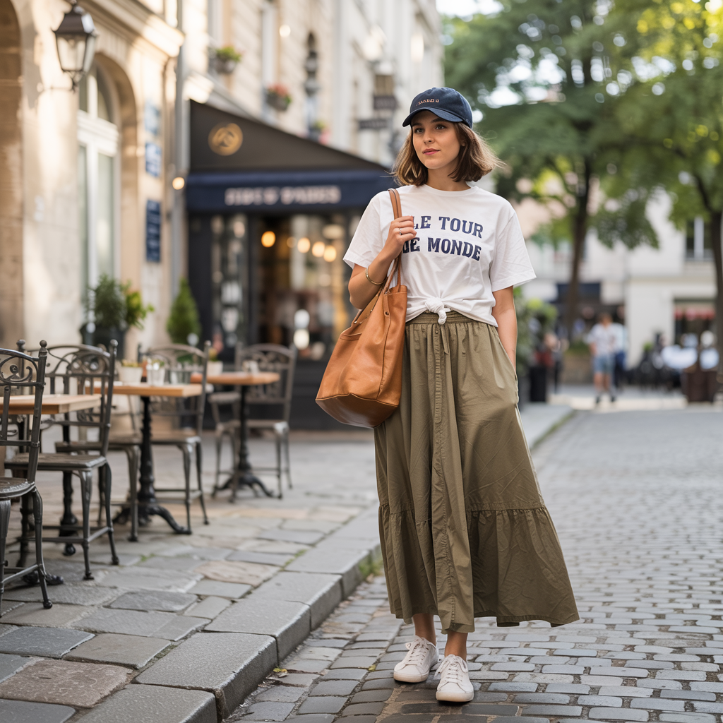 Classic white sneakers + maxi skirt + tucked vintage tee + baseball cap.